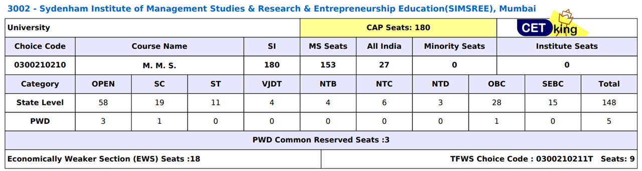 | Seats in Sydenham College MBA for State Level for TFWS Category is 18 |