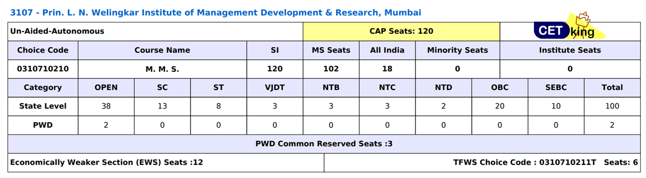 Welingkar MMS Seats distribution
